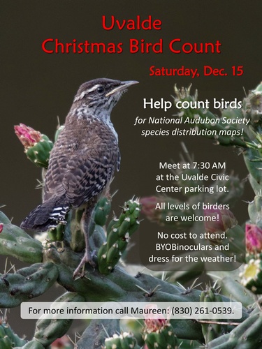 All are invited to help us count birds in and around Uvalde. The data collected will go in the National Audubon Society's database, which has been holding this event for over 100 years! All skill levels are welcome. Bring your own binoculars and dress for the weather. You will need to participate for the full day for our count data to be valid.